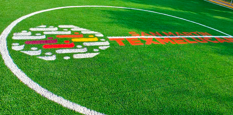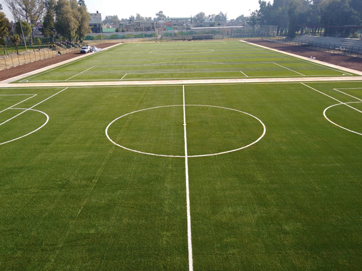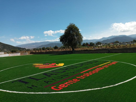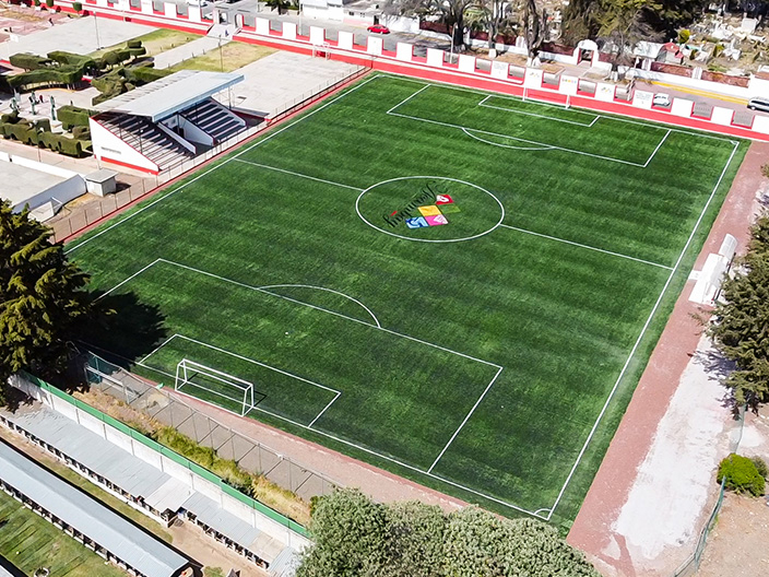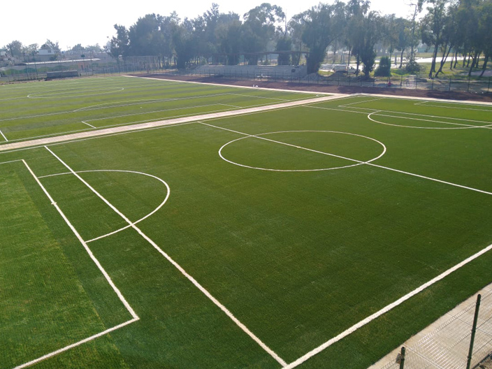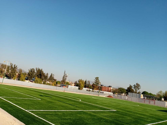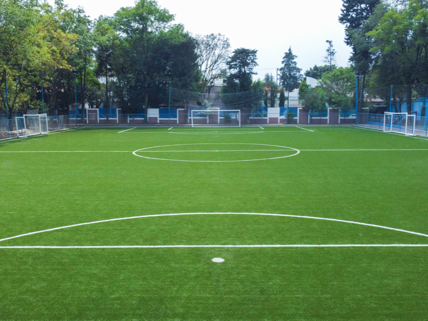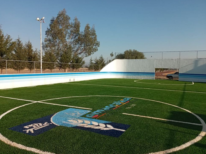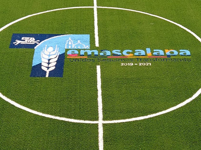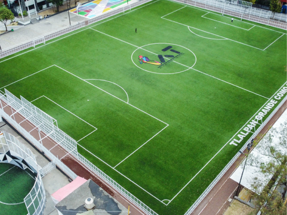 Cancha de fútbol soccer y dos logotipos de gobierno en Tlalpan, CDMX