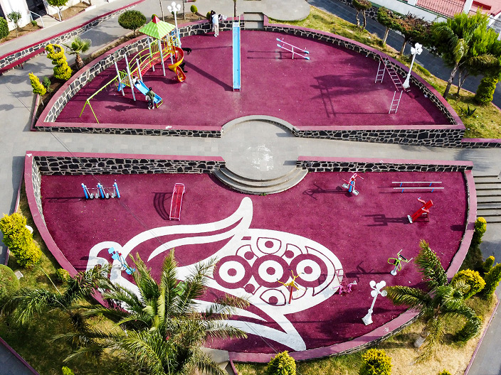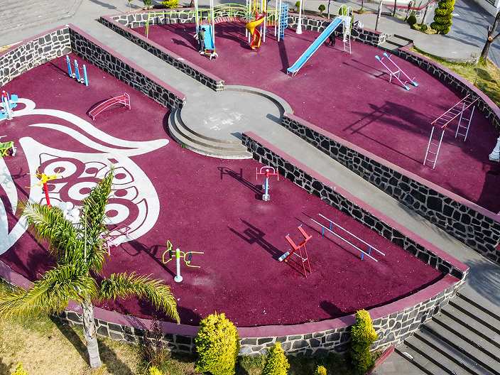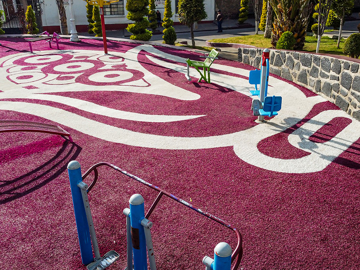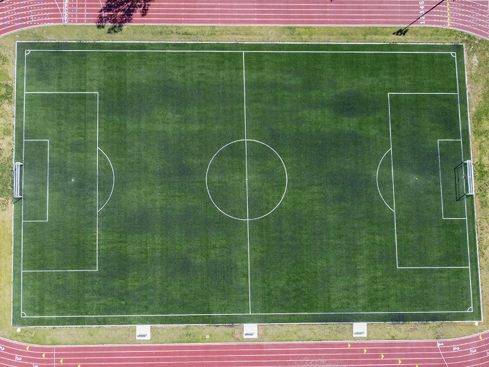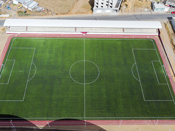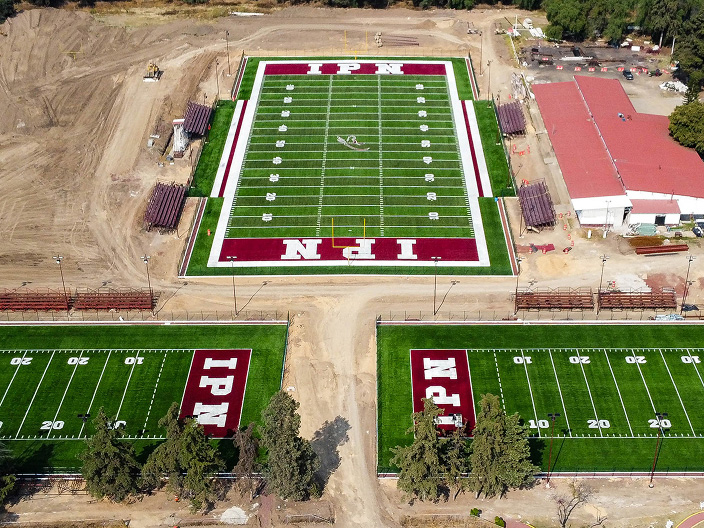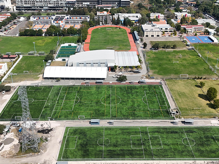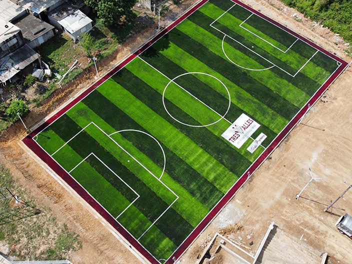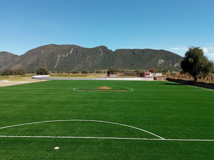Cancha de fútbol soccer y dos logotipos de gobierno en Tlalpan, CDMX