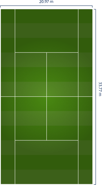 Una cancha de tenis cuenta con un área de juego de 23.77 m de largo por 10.97 m de ancho según las medidas oficiales de la CONADE en México y se recomienda una extensión de 5 m a cada lado para el desplazamiento de los jugadores dando un total de 33.77 m x 20.97 m.